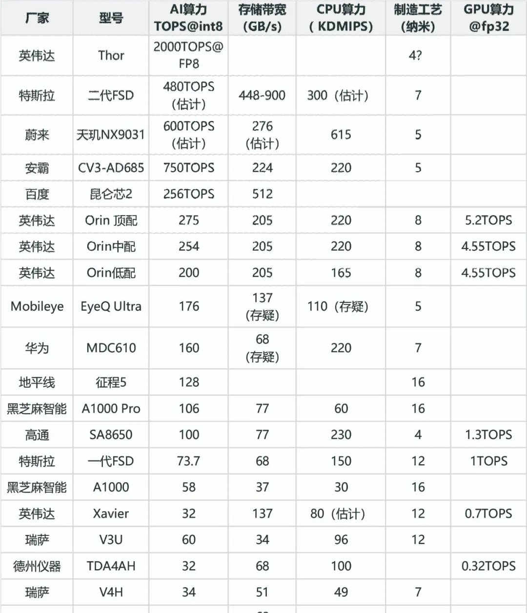 智能駕駛芯片TOP20