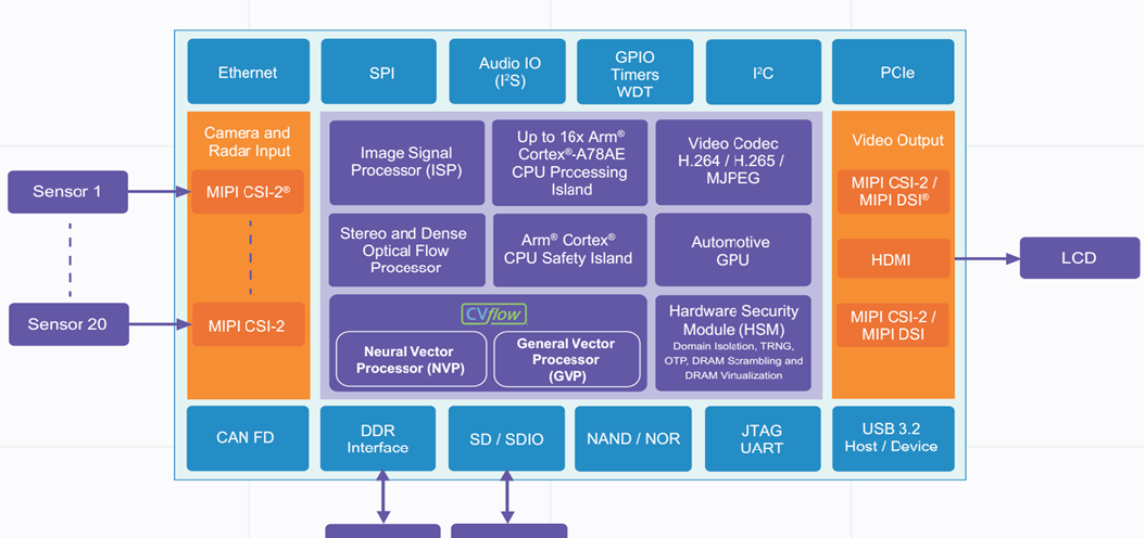 安霸CV3-AD是一款高性能的汽車AI芯片,最高包括了16核心的Coretex-A78AE,具有極高的CPU算力。同時,它也通過了ASIL-B級認證,這意味著它具有高度的可靠性和安全性。在AI算力方面,安霸CV3-AD等效于500TOPS,表現出色。